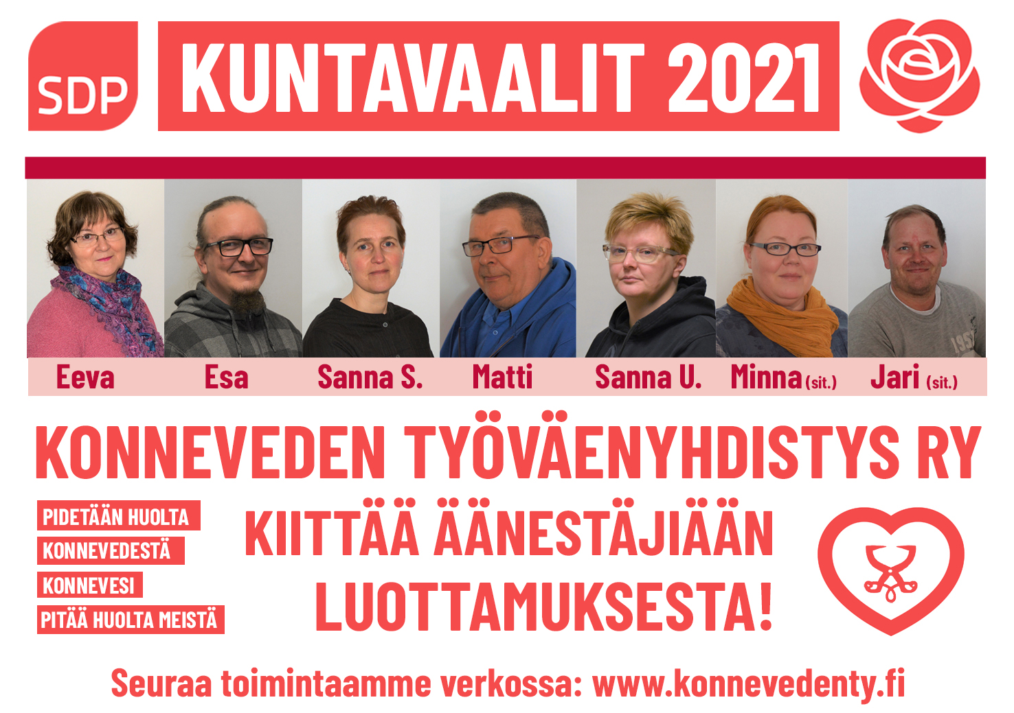 Suomessa pidettiin kunnallisvaalit kaudelle 2021-2024 sunnuntaina 13.6.2021. Konneveden työväenyhdistyksen ja täten SDP:n ehdokkaista Konneveden kunnanvaltuustoon tuli valituksi 3 henkilöä.